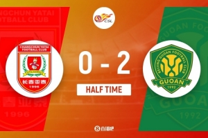 伤停补时7分钟。上半场比赛结束,长春亚泰0-2北京国安。